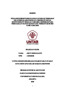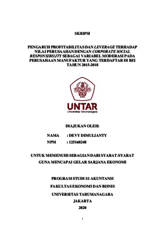 DIMULIANTY, DEVY (2020) PENGARUH PROFITABILITAS DAN LEVERAGE TERHADAP NILAI PERUSAAHAN DENGAN CORPORATE SOCIAL RESPONSIBILITY SEBAGAI VARIABEL MODERASI PADA PERUSAHAAN MANUFAKTUR YANG TERDAFTAR DI BEI TAHUN 2015-2018. Skripsi thesis, Universitas Tarumanagara.