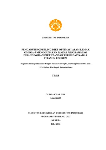 Charissa, Olivia (2016) PENGARUH KONSELING DIET OPTIMASI ASAM LEMAK OMEGA-3 MENGGUNAKAN LINEAR PROGRAMMING DIBANDINGKAN DIET STANDAR TERHADAP KADAR VITAMIN E SERUM, Kajian khusus pada anak dengan risiko overweight, anak overweight dan anak obes usia 12-24 bulan di wilayah Jakarta timur. Masters thesis, Universitas Tarumanagara.