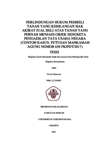 Gunawan, Novia (2021) Perlindungan Hukum Pembeli Tanah Yang Kehilangan Hak Akibat Jual Beli Atas Tanah Yang Pernah Menjadi Objek Sengketa Pengadilan Tata Usaha Negara (Contoh Kasus: Putusan Mahkamah Agung Nomor 658 PK/Pdt/2017). Masters thesis, Universitas Tarumanagara.