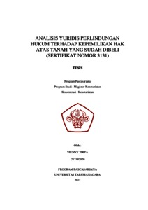 Tirta, Vienny (2021) Analisis Yuridis Perlindungan Hukum Terhadap Kepemilikan Hak Atas Tanah Yang Sudah Dibeli (Sertifikat Nomor 3131). Masters thesis, Universitas Tarumanagara.