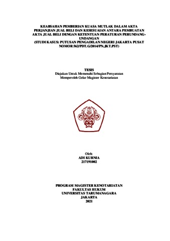 Kurnia, Adi (2021) Keabsahan Pemberian Kuasa Mutlak dalam Akta Perjanjian Jual Beli dan Kesesuaian antara Pembuatan Akta Jual Beli dengan Ketentuan Peraturan Perundang-undangan (Studi Kasus: Putusan Pengadilan Negeri Jakarta Pusat Nomor 562/PDT.G/2014/PN.JKT.PST). Masters thesis, Universitas Tarumanagara.