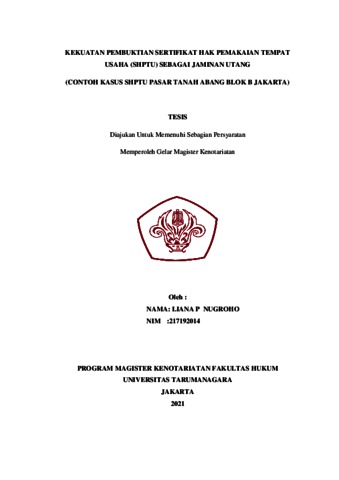 Nugroho, Liana P. (2021) Kekuatan Pembuktian Sertifikat Hak Pemakaian Tempat Usaha (SHPTU) Sebagai Jaminan Utang (Contoh Kasus SHPTU Pasar Tanah Abang Blok B Jakarta). Masters thesis, Universitas Tarumanagara.