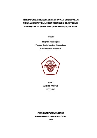 Pada tesis ini penulis mengangkat permasalahan mengenai perlindungan anak di bawah umur dalam mengakses informasi dan transaksi elektronik berdasarkan UU ITE dan UU Perlindungan Anak. Penelitian difokuskan pada kekosongan hukum yang ada dalam UU ITE dan UU Perlindungan Anak yang menyebabkan semua orang dapat mengakses informasi dan transaksi elektronik secara bebas, bahkan anak sekalipun, sehingga tidak ada pembatasan usia minimum untuk mengakses internet. Adapun masalah perlindungan anak di bawah umur dalam mengakses informasi dan transaksi elektronik berdasarkan UU ITE dan UU Perlindungan Anak? Penulis menggunakan metode penelitian hukum normatif untuk mencoba menganalisis ketentuan UU tentang isu hukum yang sedang dikaji untuk selanjutnya ditemukan jalan penyelesaiannya dihubungkan dengan asas hukum yang berlaku. Adapun jawaban dari permasalahan tersebut adalah memang belum ada aturan hukum yang secara spesifik menyebutkan batasan umur seorang anak dalam mengakses informasi dan transaksi elektronik, sehingga menurut penulis hal ini perlu menjadi perhatian serius bagi seluruh stakeholder, sehingga dibutuhkan langkah perlindungan hukum preventif yang wajib dilakukan oleh pemerintah, penyedia jasa platform, serta masyarakat.