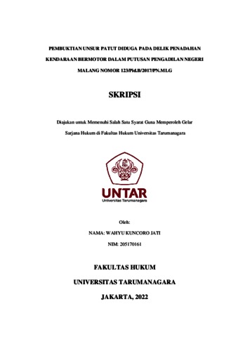 Jati, Wahyu Kuncoro (2022) Pembuktian Unsur Patut Diduga Pada Delik Penadahan Kendaraan Bermotor Dalam Putusan Pengadilan Negeri Malang Nomor 123/Pid.B/2017/Pn.Mlg. Skripsi thesis, Universitas Tarumanagara.