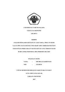 Harryman, Michelle (2017) RETURN ON ASSET (ROA), PRICE TO BOOK VALUE (PBV) DAN EARNINGS PER SHARE (EPS) MEMPENGARUHI RETURN SAHAM PADA PERUSAHAAN MANUFAKTUR YANG TERDAFTAR DI BURSA EFEK INDONESIA (BEI) PERIODE 2012-2015. Skripsi thesis, UNIVERSITAS TARUMANAGARA.