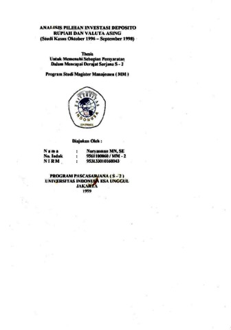 Nuryasman, Thesis (1999) Analisis pilihan investasi deposito rupiah valuta asing. Masters thesis, Universitas Tarumanagara.