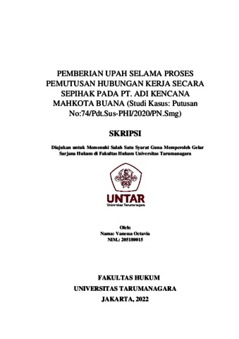 Octavia, Vanessa (2022) Pemberian Upah Selama Proses Pemutusan Hubungan Kerja Secara Sepihak Pada PT. Adi Kencana Mahkota Buana (Studi Kasus: Putusan No:74/Pdt.Sus-PHI/2020/PN.Smg). Skripsi thesis, Universitas Tarumanagara.