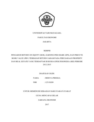 Prisilia, Mesya (2017) PENGARUH RETURN ON EQUITY (ROE), EARNING PER SHARE (EPS), DAN PRICE TO BOOK VALUE (PBV) TERHADAP RETURN SAHAM PADA PERUSAHAAN PROPERTY DAN REAL ESTATE YANG TERDAFTAR DI BURSA EFEK INDONESIA (BEI) PERIODE 2012-2015. Skripsi thesis, UNIVERSITAS TARUMANAGARA.