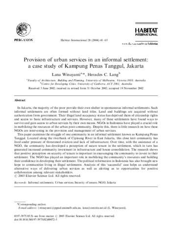 Winayanti, Lana Provision of urban services in an informal settlement: a case study of Kampung Penas Tanggul, Jakarta. Provision of urban services in an informal settlement: a case study of Kampung Penas Tanggul, Jakarta.