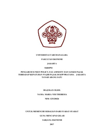 Theresia, Maria Visi (2017) PENGARUH SUNSET POLICY,TAX AMNESTY DAN SANKSI PAJAK TERHADAP KEPATUHAN WA JAIB PAJAK DI KPP PRATAMA JAKARTA TANAH ABANG SATU. Skripsi thesis, UNIVERSITAS TARUMANAGARA.