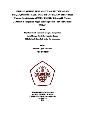 Simbolon, Fraendo Dylan (2022) Analisis Yuridis Terhadap Wanprestasi Dalam Perjanjian Bagi Hasil Yang Dibuat Secara Lisan (Studi Putusan Sengketa Antara Febi Luzyantar Dengan H. Djaya Jumena Di Pengadilan Negeri Bandung Nomor : 183/ Pdt.G/ 2020/ Pn.Bdg). Masters thesis, Universitas Tarumanagara.