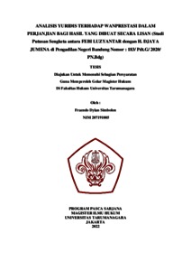 Perjanjian merupakan hal yang sering terjadi dalam kehidupan bermasyarakat bahkan sudah menjadi kebiasaan. Perjanjian ialah, suatu peristiwa dimana seorang berjanji kepada seorang lainnya atau dimana dua orang itu, berjanji untuk melaksanakan suatu hal yang menimbulkan akibat hukum. Tujuan tesis ini adalah mengkaji secara hukum dasar pertimbangan hakim memutus perkara wanprestasi pada perjanjian lisan antara FEBI LUZYANTAR dengan H. DJAYA JUMENA di Pengadilan Negeri Bandung Nomor : 183/ Pdt.G/ 2020/ PN.Bdg. Pokok problematika yang dibahas antara lain yaitu perjanjian secara umum, akibat hukum wanprestasi didalam perjanjian lisan, penyebab terjadinya wanprestasi sebagaimana yang terjadi oleh akibat hukum perjanjian lisan. Terhadap pihak yang melakukan wanprestasi di dalam perjanjian lisan serta, analisis mengenai Putusan Hakim No. 183/ Pdt.G/ 2020/ PN. Bdg.
