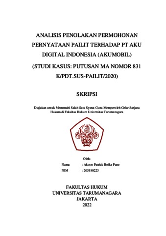 Pane, Aksses Patrick Boike (2022) Analisis Penolakan Permohonan Pernyataan Pailit Terhadap PT Aku Digital Indonesia (Akumobil) (Studi Kasus: Putusan MA No. 831 K/Pdt.Sus-Pailit/2020). Masters thesis, Universitas Tarumanagara.