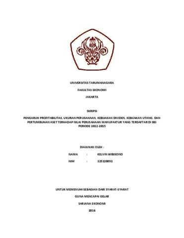 Wibisono, Kelvin (2016) PENGARUH PROFITABILITAS, UKURAN PERUSAHAAN, KEBIJAKAN DIVIDEN, KEBIJAKAN UTANG, DAN PERTUMBUHAN ASET TERHADAP NILAI PERUSAHAAN YANG TERDAFTAR DI BURSA EFEK INDONESIA PADA PERIODE 2012-2015. Skripsi thesis, UNIVERSITAS TARUMANAGARA.