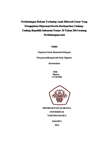 Monica, Monica (2022) Perlindungan Hukum Terhadap Anak Dibawah Umur Yang Mengajukan Dispensasi Kawin Berdasarkan Undang-Undang Republik Indonesia Nomor 35 Tahun 2014 Tentang Perlindungan Anak. Masters thesis, Universitas Tarumanagara.