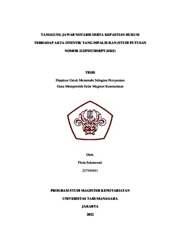 Sukmawati, Fitria (2022) Tanggung Jawab Hukum Notaris Serta Kepastian Hukum Terhadap Akta Otentik Yang Dipalsukan (Studi Putusan Nomor: 212/PDT/2018/PT.MKS). Masters thesis, Universitas Tarumanagara.