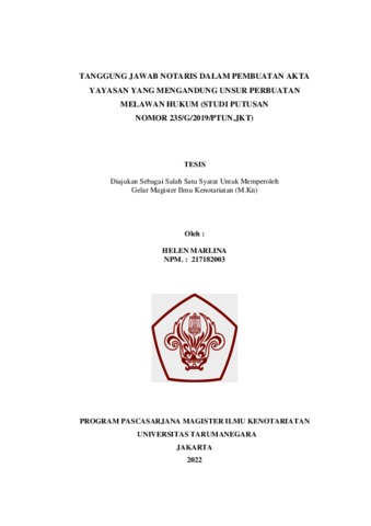 Marlina, Helens (2022) Tanggung Jawab Notaris dalam Pembuatan Akta Yayasan yang Mengandung Unsur Perbuatan Melawan Huku (Studi Putusan Nomor: 235/G/2019/PTUN.JKT. Masters thesis, Universitas Tarumanagara.
