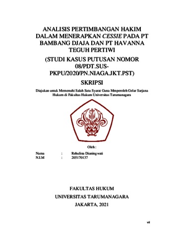 Dianingwati, Rehulina (2022) Analisis Pertimbangan Hakim dalam menerapkan cessie pada PT Bambang Djaja dan PT Havanna Teguh Pertiwi (Studi Kasus Putusan Nomor 08/pdt.sus-pkpu/2020/pn.niaga.jkt.pst). Skripsi thesis, Universitas Tarumanagara.
