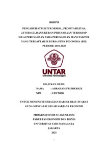 FRIEDERICK, ABRAHAM (2021) PENGARUH STRUKTUR MODAL, PROFITABILITAS, LEVERAGE, DAN UKURAN PERUSAHAAN TERHADAP NILAI PERUSAHAAN PADA PERUSAHAAN MANUFAKTUR YANG TERDAFTAR DI BURSA EFEK INDONESIA (BEI) PERIODE 2018-2020. Skripsi thesis, Universitas Tarumanagara.
