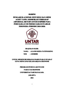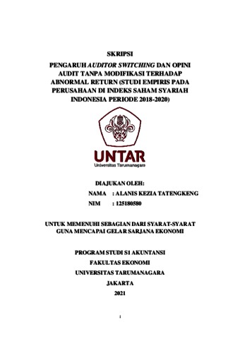 TATENGKENG, ALANIS KEZIA (2021) PENGARUH AUDITOR SWITCHING DAN OPINI AUDIT TANPA MODIFIKASI TERHADAP ABNORMAL RETURN (STUDI EMPIRIS PADA PERUSAHAAN DI INDEKS SAHAM SYARIAH INDONESIA PERIODE 2018-2020). Diploma thesis, Universitas Tarumanagara.