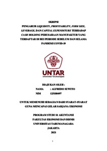SUWITO, ALFREDO (2021) PENGARUH LIQUIDITY, PROFITABILITY, FIRM SIZE, LEVERAGE, DAN CAPITAL EXPENDITURE TERHADAP CASH HOLDING PERUSAHAAN MANUFAKTUR YANG TERDAFTAR DI BEI PERIODE SEBELUM DAN SELAMA PANDEMI COVID-19. Skripsi thesis, Universitas Tarumanagara.