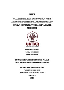 ANGELICA, ANGELICA (2021) ANALISIS PENGARUH LIQUIDITY, DAN TOTAL ASSET TURNOVER TERHADAP DIVIDEND POLICY DENGAN PROFITABILITY SEBAGAI VARIABEL MODERASI. Skripsi thesis, Universitas Tarumanagara.