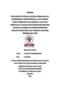 RAHMADHANI, ANGGITA (2021) PENGARUH LEVERAGE, UKURAN PERUSAHAAN, KEPEMILIKAN INSTITUSIONAL, DAN KOMITE AUDIT TERHADAP MANAJEMEN LABA PADA PERUSAHAAN MANUFAKTUR SEKTOR INDUSTRI DASAR DAN KIMIA DAN SEKTOR INDUSTRI BARANG KONSUMSI YANG TERDAFTAR DI BEI PERIODE 2017-2019. Skripsi thesis, Universitas Tarumanagara.