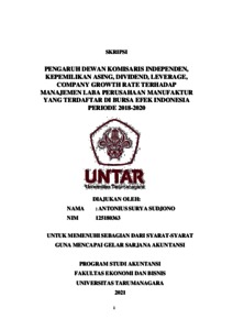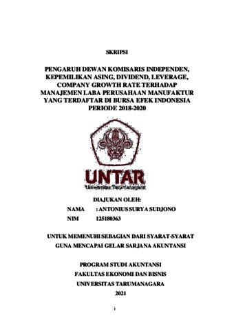 SUDJONO, ANTONIUS SURYA (2021) PENGARUH DEWAN KOMISARIS INDEPENDEN, KEPEMILIKAN ASING, DIVIDEND, LEVERAGE, COMPANY GROWTH RATE TERHADAP MANAJEMEN LABA PERUSAHAAN MANUFAKTUR YANG TERDAFTAR DI BURSA EFEK INDONESIA PERIODE 2018-2020. Skripsi thesis, Universitas Tarumanagara.