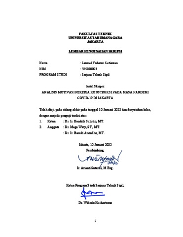 Setiawan, Samuel Yohanes (2022) Analisis motivasi pekerja konstruksi pada masa pandemi covid-19 di Jakarta. Skripsi thesis, Universitas Tarumanagara.