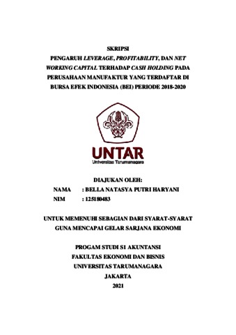 HARYANI, BELLA NATASYA PUTRI (2021) PENGARUH LEVERAGE, PROFITABILITY, DAN NET WORKING CAPITAL TERHADAP CASH HOLDING PADA PERUSAHAAN MANUFAKTUR YANG TERDAFTAR DI BURSA EFEK INDONESIA (BEI) PERIODE 2018-2020. Skripsi thesis, Universitas Tarumanagara.