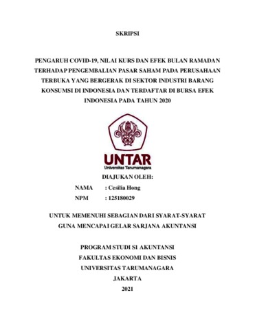 Hong, Cesilia (2021) PENGARUH COVID-19, NILAI KURS DAN EFEK BULAN RAMADAN TERHADAP PENGEMBALIAN PASAR SAHAM PADA PERUSAHAAN TERBUKA YANG BERGERAK DI SEKTOR INDUSTRI BARANG KONSUMSI DI INDONESIA DAN TERDAFTAR DI BURSA EFEK INDONESIA PADA TAHUN 2020. Skripsi thesis, Universitas Tarumanagara.
