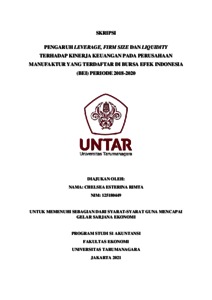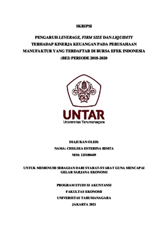 RIMTA, CHELSEA ESTERINA (2021) PENGARUH LEVERAGE, FIRM SIZE DAN LIQUIDITY TERHADAP KINERJA KEUANGAN PADA PERUSAHAAN MANUFAKTUR YANG TERDAFTAR DI BURSA EFEK INDONESIA (BEI) PERIODE 2018-2020. Skripsi thesis, Universitas Tarumanagara.