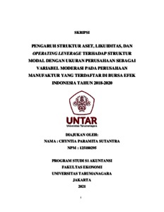 SUTANTRA, CHYNTIA PARAMITA (2021) PENGARUH STRUKTUR ASET, LIKUIDITAS, DAN OPERATING LEVERAGE TERHADAP STRUKTUR MODAL DENGAN UKURAN PERUSAHAAN SEBAGAI VARIABEL MODERASI PADA PERUSAHAAN MANUFAKTUR YANG TERDAFTAR DI BURSA EFEK INDONESIA TAHUN 2018-2020. Skripsi thesis, Universitas Tarumanagara.