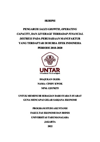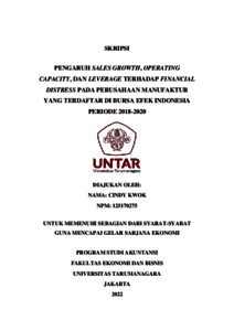 KWOK, CINDY (2021) PENGARUH SALES GROWTH, OPERATING CAPACITY, DAN LEVERAGE TERHADAP FINANCIAL DISTRESS PADA PERUSAHAAN MANUFAKTUR YANG TERDAFTAR DI BURSA EFEK INDONESIA PERIODE 2018-2020. Skripsi thesis, Universitas Tarumanagara.
