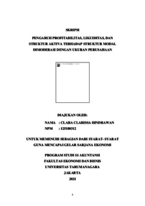 HINDRAWAN, CLARA CLARISSA (2021) PENGARUH PROFITABILITAS, LIKUIDITAS, DAN STRUKTUR AKTIVA TERHADAP STRUKTUR MODAL DIMODERASI DENGAN UKURAN PERUSAHAAN. Skripsi thesis, Universitas Tarumanagara.