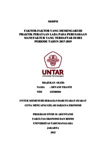 TISANTI, DEVANI (2021) FAKTOR-FAKTOR YANG MEMENGARUHI PRAKTIK PERATAAN LABA PADA PERUSAHAAN MANUFAKTUR YANG TERDAFTAR DI BEI PERIODE TAHUN 2017-2019. Skripsi thesis, Universitas Tarumanagara.