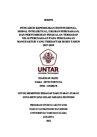 FORTUNA, DEWI (2021) PENGARUH KEPEMILIKAN INSTITUSIONAL, MODAL INTELEKTUAL, UKURAN PERUSAHAAN, DAN PERTUMBUHAN PENJUALAN TERHADAP NILAI PERUSAHAAN PADA PERUSAHAAN MANUFAKTUR YANG TERDAFTAR DI BEI TAHUN 2017-2019. Skripsi thesis, Universitas Tarumanagara.