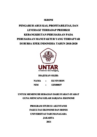 HON, ELVIN (2021) PENGARUH ARUS KAS, PROFITABILITAS, DAN LEVERAGE TERHADAP PREDIKSI KEBANGKRUTAN PERUSAHAAN PADA PERUSAHAAN MANUFAKTUR YANG TERDAFTAR DI BURSA EFEK INDONESIA TAHUN 2018-2020. Skripsi thesis, Universitas Tarumanagara.