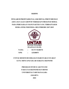 MARENI, ELYN (2021) PENGARUH PROFITABILITAS, LIKUIDITAS, PERTUMBUHAN ASET, DAN SALES GROWTH TERHADAP STRUKTUR MODAL PADA PERUSAHAAN MANUFAKTUR YANG TERDAFTAR DI BURSA EFEK INDONESIA (BEI) PERIODE 2017-2019. Skripsi thesis, Universitas Tarumanagara.