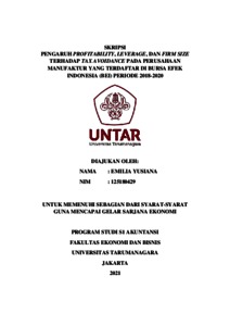 YUSIANA, EMILIA (2021) PENGARUH PROFITABILITY, LEVERAGE, DAN FIRM SIZE TERHADAP TAX AVOIDANCE PADA PERUSAHAAN MANUFAKTUR YANG TERDAFTAR DI BURSA EFEK INDONESIA (BEI) PERIODE 2018-2020. Skripsi thesis, Universitas Tarumanagara.