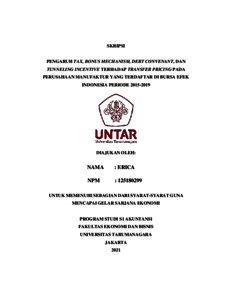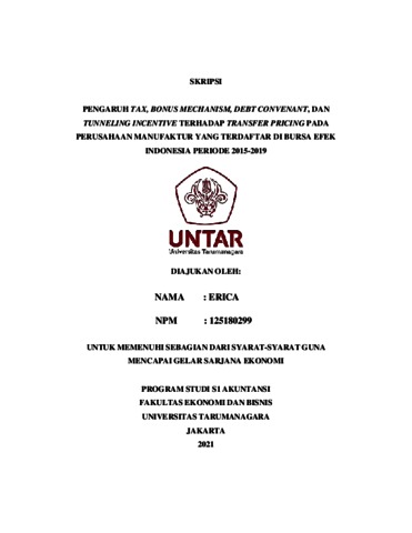 ERICA, ERICA (2021) PENGARUH TAX, BONUS MECHANISM, DEBT CONVENANT, DAN TUNNELING INCENTIVE TERHADAP TRANSFER PRICING PADA PERUSAHAAN MANUFAKTUR YANG TERDAFTAR DI BURSA EFEK INDONESIA PERIODE 2015-2019. Skripsi thesis, Universitas Tarumanagara.