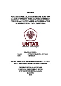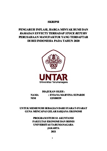 SUPARDI, EVIANA MARVINA (2021) PENGARUH INFLASI, HARGA MINYAK BUMI DAN RAMADAN EFFECTS TERHADAP STOCK RETURN PERUSAHAAN MANUFAKTUR YANG TERDAFTAR DI BEI INDONESIA PADA TAHUN 2020. Skripsi thesis, Universitas Tarumanagara.