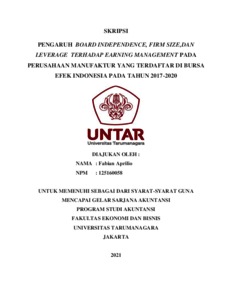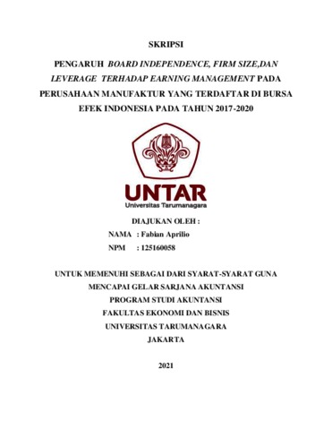 Aprilio, Fabian (2021) PENGARUH BOARD INDEPENDENCE, FIRM SIZE,DAN LEVERAGE TERHADAP EARNING MANAGEMENT PADA PERUSAHAAN MANUFAKTUR YANG TERDAFTAR DI BURSA EFEK INDONESIA PADA TAHUN 2017-2020. Skripsi thesis, Universitas Tarumanagara.