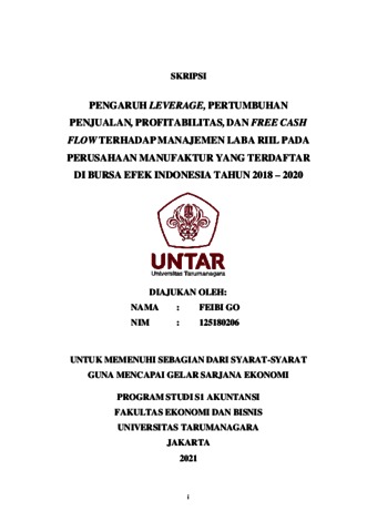 FEIBI GO, FEIBI GO (2021) PENGARUH LEVERAGE, PERTUMBUHAN PENJUALAN, PROFITABILITAS, DAN FREE CASH FLOW TERHADAP MANAJEMEN LABA RIIL PADA PERUSAHAAN MANUFAKTUR YANG TERDAFTAR DI BURSA EFEK INDONESIA TAHUN 2018 – 2020. Skripsi thesis, Universitas Tarumanagara.