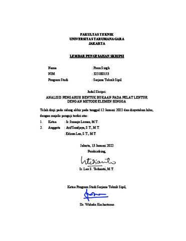 Singh, Prem (2022) Analisis pengaruh bentuk bukaan pada pelat lentur dengan metode elemen hingga. Skripsi thesis, Universitas Tarumanagara.