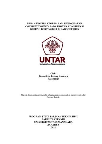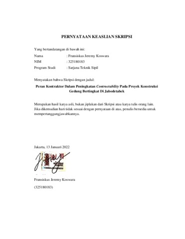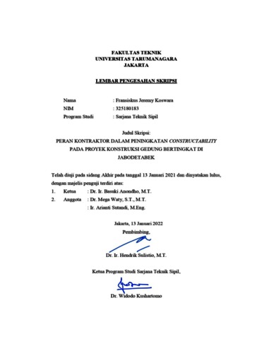 Koswara, Fransiskus Jeremy (2022) Peran kontraktor dalam peningkatan constructability pada proyek konstruksi gedung bertingkat di Jabodetabek. Skripsi thesis, Universitas Tarumanagara.