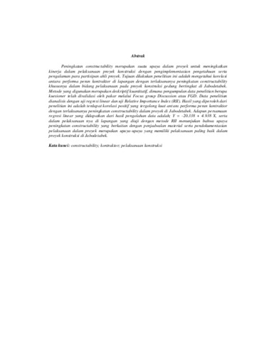 Peningkatan constructability merupakan suatu upaya dalam proyek untuk meningkatkan kinerja dalam pelaksanaan proyek konstruksi dengan pengimplementasian pengetahuan serta pengalaman para partisipan ahli proyek. Tujuan dilakukan penelitian ini adalah mengetahui korelasi antara performa peran kontraktor di lapangan dengan terlaksananya peningkatan constructability khususnya dalam bidang pelaksanaan pada proyek konstruksi gedung bertingkat di Jabodetabek. Metode yang digunakan merupakan deskriptif kuantitatif, dimana pengumpulan data penelitian berupa kuesioner telah divalidasi oleh pakar melalui Focus group Discussion atau FGD. Data penelitian dianalisis dengan uji regresi linear dan uji Relative Importance Index (RII). Hasil yang diperoleh dari penelitian ini adalah terdapat korelasi positif yang tergolong kuat antara performa peran kontraktor dengan terlaksananya peningkatan constructability dalam proyek di Jabodetabek. Adapun persamaan regresi linear yang didapatkan dari hasil pengolahan data adalah; Y = -20.338 + 4.938 X, serta dalam pelaksanaan nya di lapangan yang diuji dengan metode RII menunjukan bahwa upaya peningkatan constructability yang berkaitan dengan penjadwalan material serta pendokumentasian pelaksanaan dalam proyek merupakan upaya-upaya yang memiliki pelaksanaan paling baik dalam proyek konstruksi di Jabodetabek. Kata kunci: constructability; kontraktor; pelaksanaan konstruksi