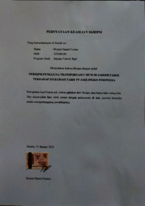 Forino, Bryant Daniel (2022) Persepsi pengguna transportasi umum di Jabodetabek terhadap integrasi tarif PT Jaklingko Indonesia. Skripsi thesis, Universitas Tarumanagara.