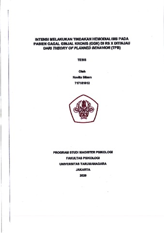 Silaen, Novita (2022) Intensi melakukan tindakan hemodialisis pada pasien Gagal Ginjal Kronis (GGK) di RS X ditinjau dari Theory of Planned Behavior (TPB). Masters thesis, Universitas Tarumanagara.