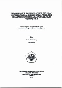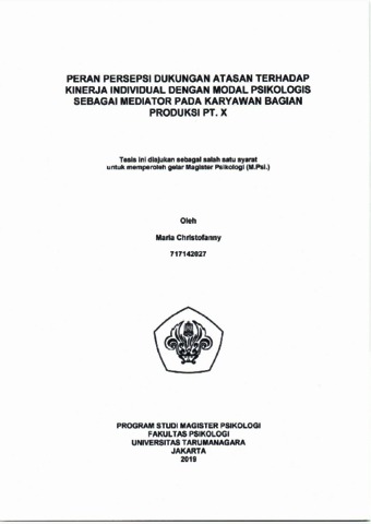 Christofanny, Maria (2022) PERAN PERSEPSI DUKUNGAN ATASAN TERHADAP KINERJA KARYAWAN DENGAN MODAL PSIKOLOGIS SEBAGAI MEDIATOR PADA KARYAWAN BAGIAN PRODUKSI PT. X. Masters thesis, Universitas Tarumanagara.